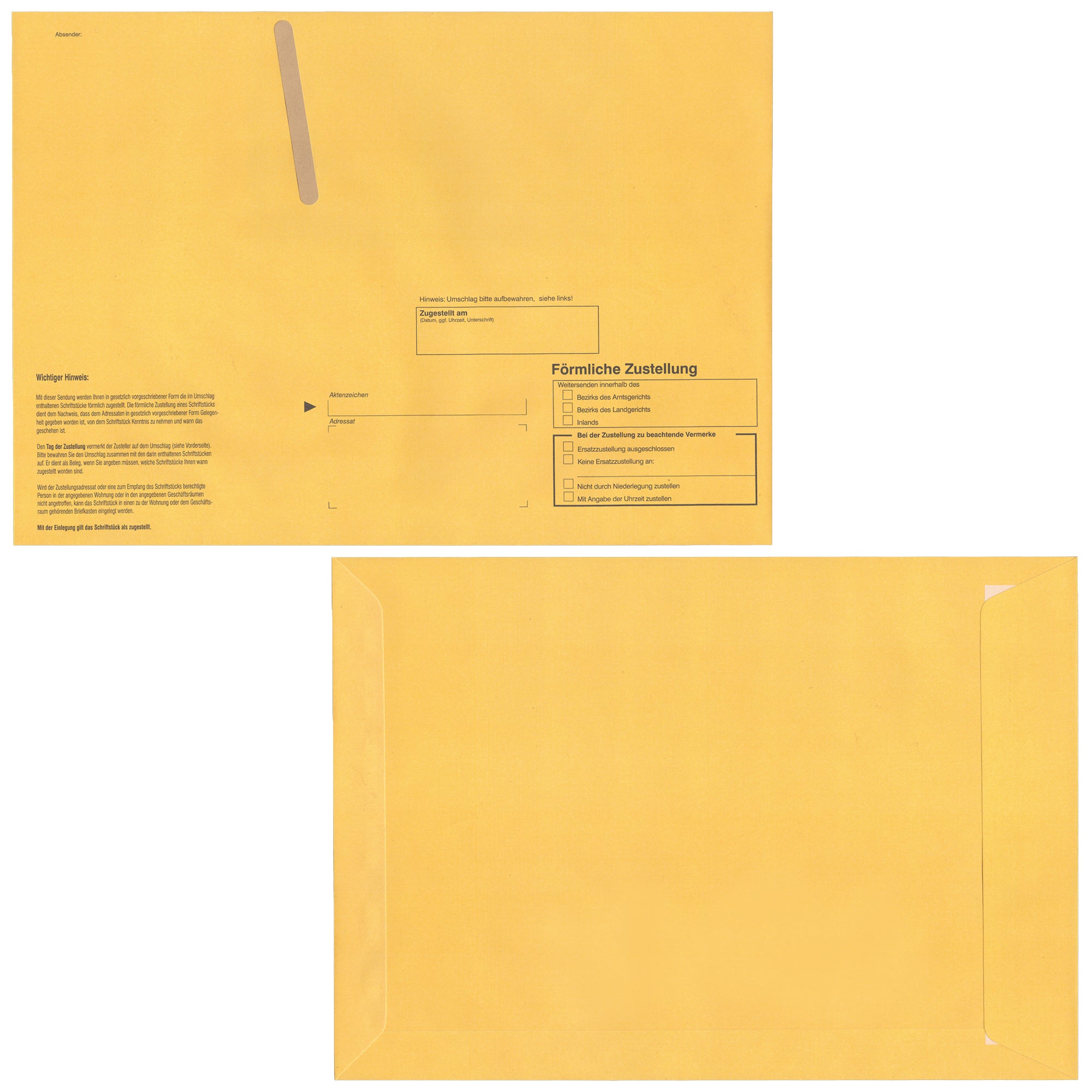 Die Zustellungshüllen C4 ohne Fenster sind ideal für die sichere und rechtskonforme förmliche Zustellung von Dokumenten. Die Postzustellungshülle im Format 229 × 324 mm besteht aus 100 g/qm Offsetpapier in Gelb (HKS 4) mit weißer Innenseite und ist mit dem neutralen Vordruck „Förmliche Zustellung“ versehen. Ein praktischer Einsteckschlitz auf der Vorderseite mit braunem Inletpapier erleichtert die Dokumentenkennzeichnung. Der haftklebende Verschluss mit Abdeckstreifen ermöglicht ein schnelles und zuverlässiges Kuvertieren – perfekt für Behörden, Kanzleien und Unternehmen.